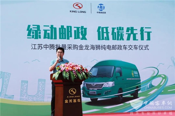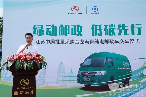 随后,江苏中腾新能源有限公司董事长陈奕华先生上台致辞,他表达了对金龙海狮纯电动车型品质及服务的肯定,他说:“今年3月,金龙客车交付给江苏中腾的12台海狮纯电动邮政车已投入使用,鉴于对车辆使用过程非常满意,此次又复购了56台,将投放至其他省市,为邮政系统注入金龙绿色动能。”最后,陈董表示将与金龙客车展开进一步的深度合作,开创更广阔的未来。