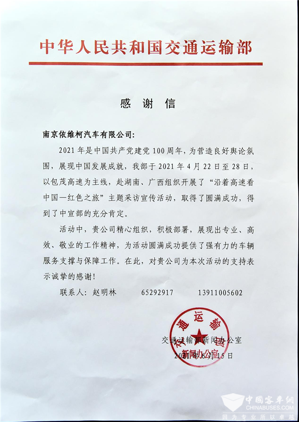 感谢信中写道,2021年是中国共产党建党100周年,交通运输部于2021年4月22日至28日,以包茂高速为主线,赴湖南、广西组织开展了“沿着高速看中国—红色之旅”主题采访宣传活动,取得了圆满成功,得到了中宣部的充分肯定。在活动中,南京依维柯精心组织,积极部署,展现出专业、高效、敬业的工作精神,为活动圆满成功提供了强有力的服务支撑与保障工作。为此,交通运输部新闻办公室对南京依维柯在本次活动作出的的支持表示诚挚的感谢。