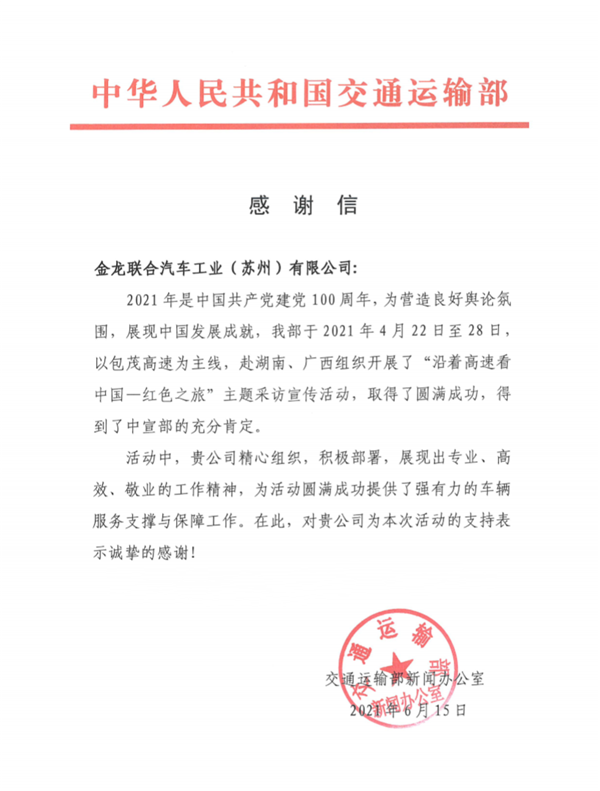 历史的车轮滚滚向前,总会在一些节点上留下特殊印记。近日,中华人民共和国交通运输部向苏州金龙发来感谢信,对苏州金龙2021年4月22日-28日全程护航“沿着高速看中国——红色之旅”活动表示感谢。一封感谢信,沉甸甸、鼓舞人心。