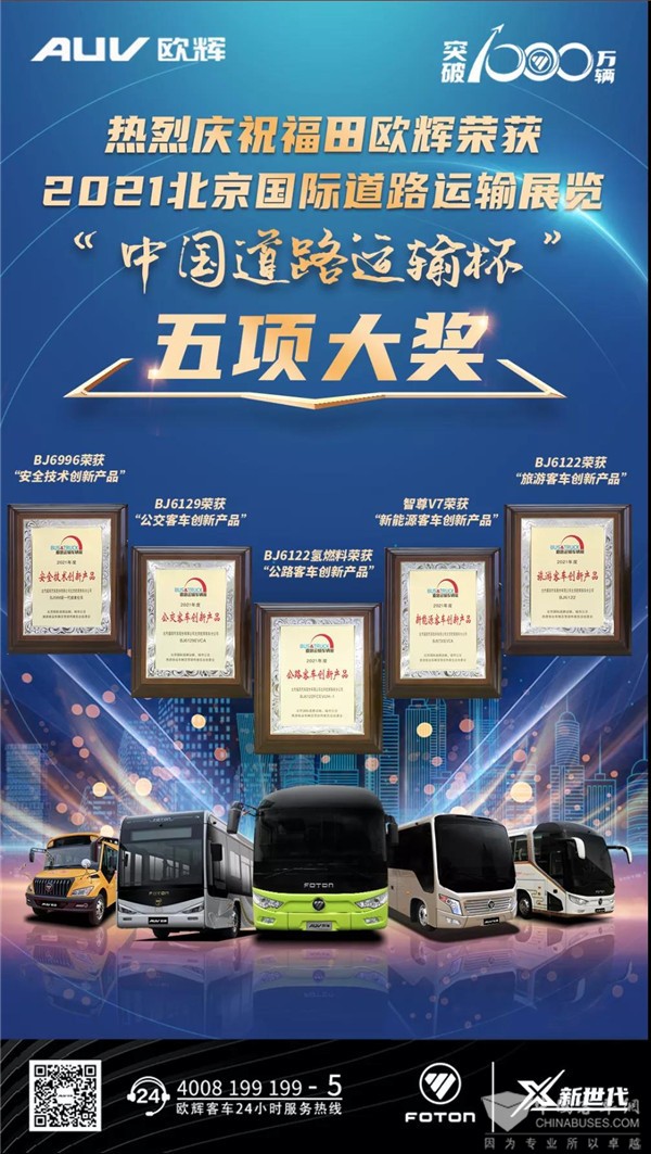 2021年高考开始发榜,2021年中国客车产业高考——2021北京国际道路运输、城市公交、旅游客运车辆及零部件展览会(以下简称“本届道展”)也同步放榜。福田欧辉凭借雄厚的技术实力与出色的产品研发能力,在“中国道路运输杯”评选活动上取得优异的成绩。
