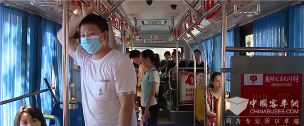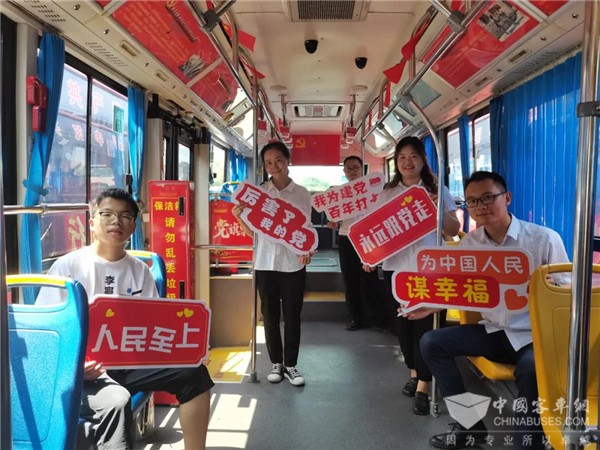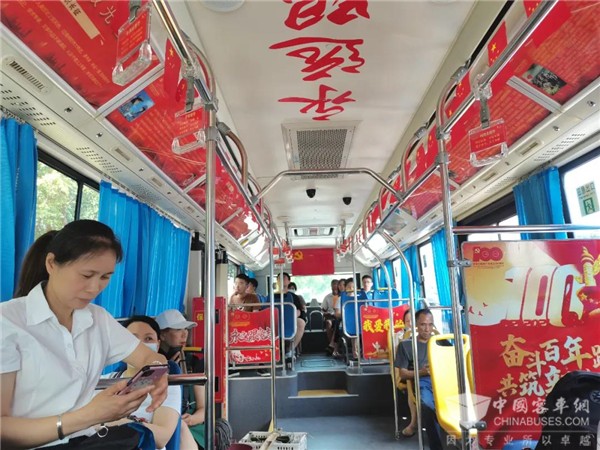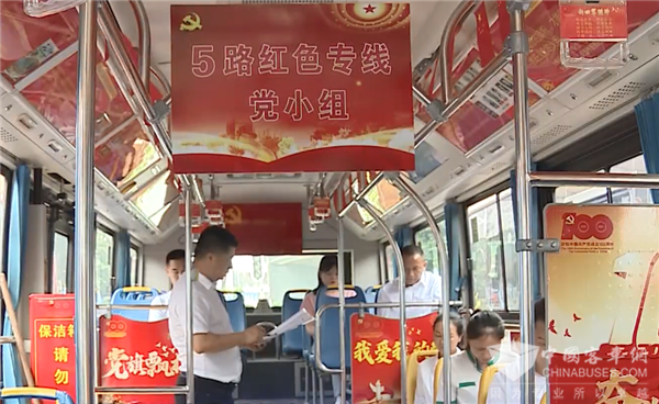 搭乘5路红色文化主题专线,映入眼帘的是车厢内外张贴的“不忘初心、牢记使命”“学党史、明初心”等红色主题内容,车载电视里滚动播放着“党史故事”“学习强国”等视听素材,让公交车成为了流动的“红色课堂”。