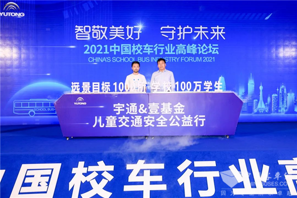 图 | 宇通客车国内营销总监孙希顺(右)与深圳壹基金公益基金会秘书长李弘共同发布儿童交通安全公益项目远景目标