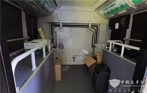 我们再从车内看车尾储物舱。这款车可以根据具体路线灵活实现客运舱和储物舱的可变设计,可变区域采用灵活开、关的可变隔断,根据人流和物流情况灵活调整功能区空间,高峰时可打通,平峰时可隔断,充分实现空间共享,充分实现运力最大化,针对性解决了目前公交客运运力利用率低的痛点。