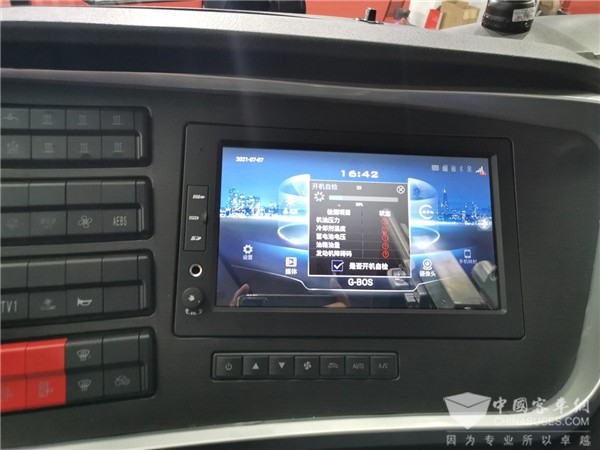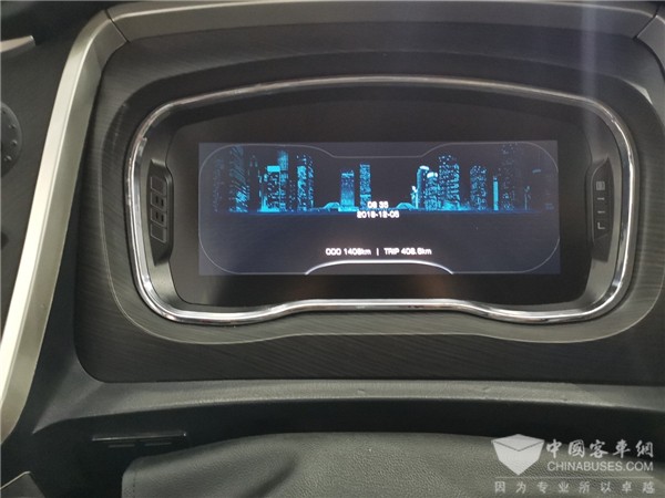 液晶显示屏在发动机启动的时候会显示出海格的标志和HIGER字母,随后就显示出仪表指针,左侧显示转速表和水温表,右侧显示速度表和油表。如果电源接通后发动机不启动,屏幕会显示时间和日期,背景是黑色天空中一个蔚蓝的城市,画面简洁却富有深意。在驾驶员的右侧还设有10.1寸液晶屏,液晶屏功能繁多,车载多媒体系统缓解了旅行家的疲惫。展车上除了装有传统后视镜,车上还装有电子后视镜,发动机启动时显示绕车检查的画面。