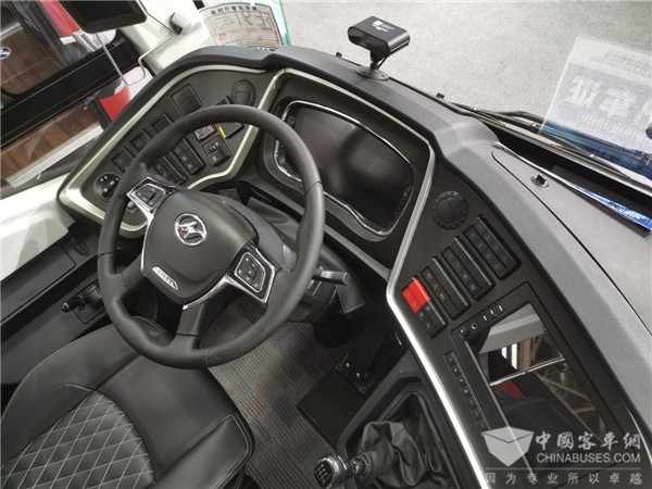 海格旅行家的车体比较高,坐在车上视野极佳,驾驶员座位稍低一些,黑色的座椅上有白色的装饰线,看起来十分精致。驾驶区域采用全液晶彩屏仪表,按下一键启动,电源接通,指示灯是绿色;踩住刹车踏板,再按一下发动机启动,此时指示灯变为红色。
