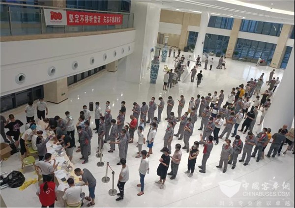 8月2日,中车电动株洲本部基地的核酸检测工作也在“火热”开展,700多名员工及家属,在志愿者组织下,分组有序排队采样。