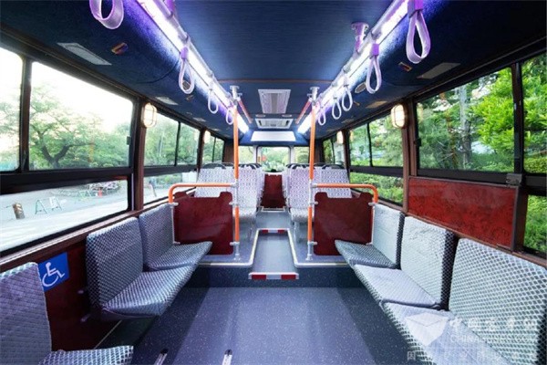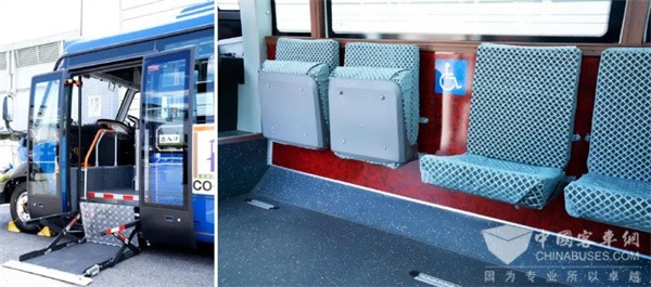 车辆特设无障碍通道,上下车有残疾人升降装置,为特殊人群提供绿色通道,车内有轮椅停放处,翻转式座椅让空间得以有效利用。