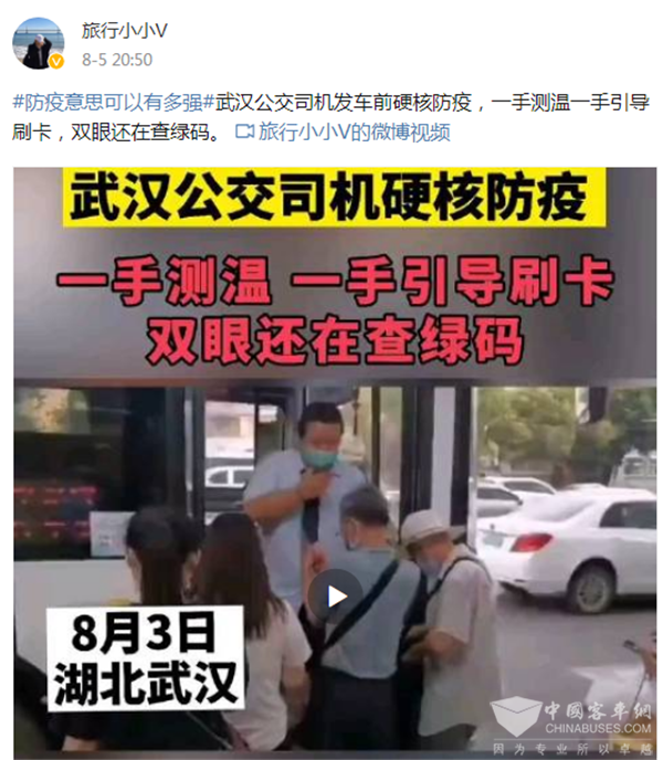 武汉一公交车司机发车前为了确保乘车人的安全,一手测温一手引导刷卡,双眼还要查大家的绿码。被网友调侃为:硬核防疫。