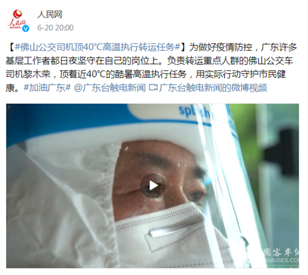 佛山一位负责转运重点人群的公交车司机,顶着近40℃的酷暑高温执行任务。层层防护下我们只能看到他眼角的汗水和坚毅的目光,他在用自己的实际行动守护着市民的健康。