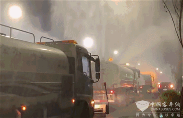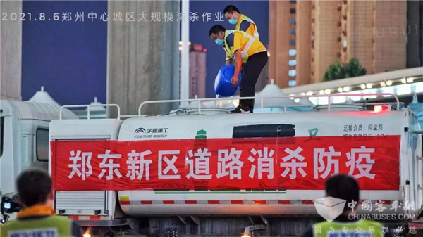 图 | 8月6日晚,宇通环卫雾炮车、清洗车在郑州中心城区进行消杀工作