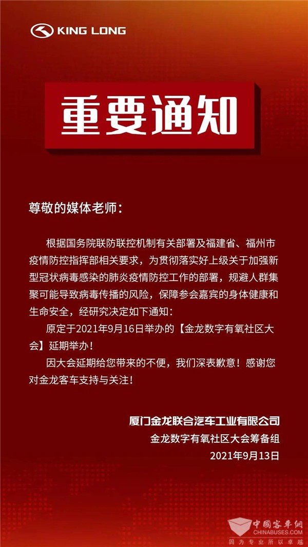 尊敬的嘉宾、媒体和关注金龙客车的伙伴们,为配合做好疫情防控工作,原定于2021年9月16日举办的【金龙数字有氧社区大会】将延期举办!