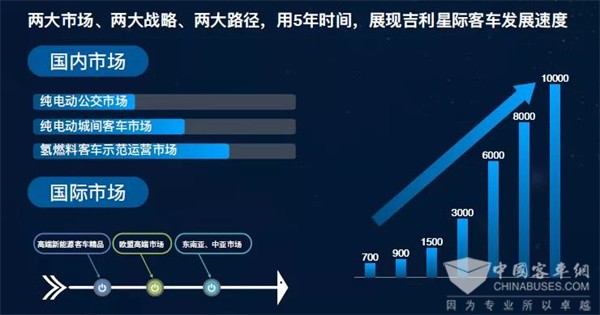 未来8-10年,吉利星际客车将同时布局国内外市场,成为一个年销量过万、收入过百亿、进入国内TOP3的一流客车企业。