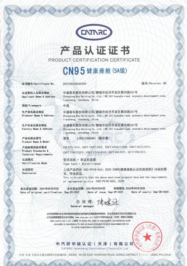 近日,中通客车新世嘉通过中汽研华诚认证(天津)有限公司“CN95健康座舱”5A级认证。值得一提的是,这也是国内首款获得该认证的旅团客车产品。