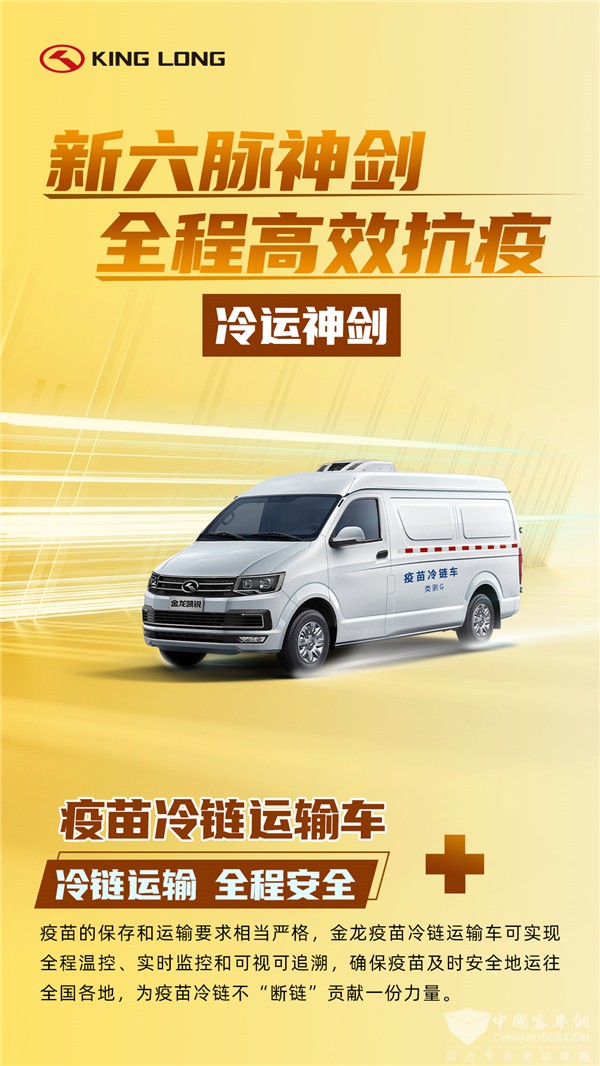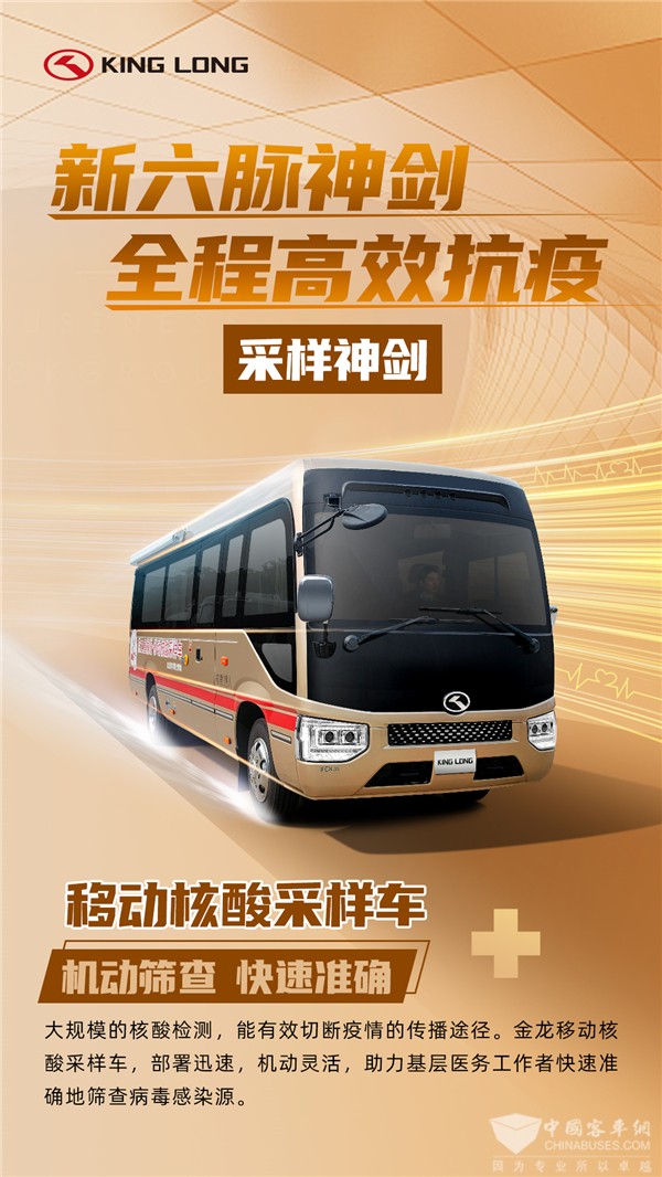 金龙客车利用自身科技技术的沉淀研发出“新六脉神剑”。它们分别是“救护神剑”负压救护车, 能够在转运病患时杜绝交叉感染;“接种神剑”移动疫苗接种车, 让不便出行的群众也能有效接种疫苗;“冷运神剑”疫苗冷链运输车,可实现全程温控、实时监控和可视可追溯;“采样神剑”移动核酸采样车,机动灵活,助力基层医务工作者快速准确地筛查病毒感染源;“筛查神剑”移动CT医疗车,可早期发现病灶,提供影像证据,可24小时运转;“检测神剑”移动核酸检测PCR实验室,可实现快速部署、灵活调动、高效检测和数据实时传输。