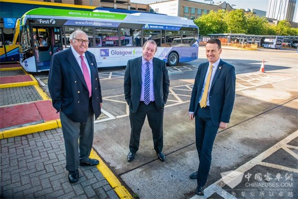 从左往右:David Wilson,苏格兰斯特拉斯克莱德交通伙伴(SPT)运营委员会主席;Graeme Dey,苏格兰交通部长;Duncan Cameron,第一巴士公司(First Bus)代理总经理