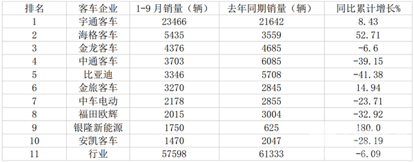 总体看,2021年前三季度大中型客车累计销量57598辆,同比下降6.09%,Top10累计销量同比4增6降,其中银隆新能源同比涨幅最大,比亚迪同比降幅最多。