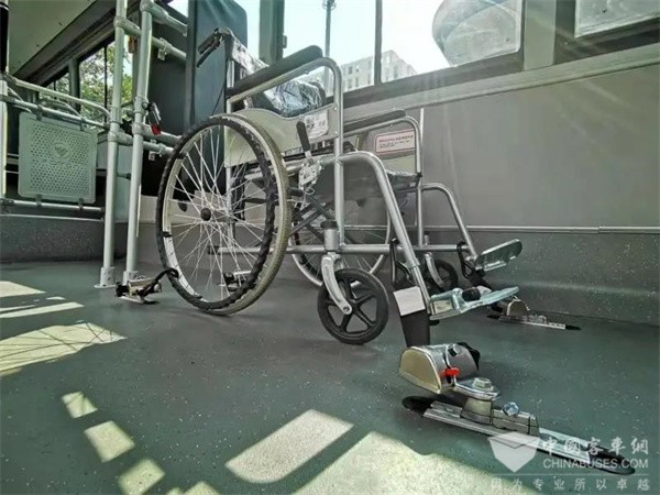 为保障残疾人运动员乘坐时的便携及舒适性,并达到防疫安全性要求,此次改制的福祉车突出四个核心功能。首先,拆除车厢中前部的座椅,改造成可同时搭载6辆轮椅的停放区,车厢后半部分则保留12个座椅供随队人员乘坐,使承载容量更大;其次,在轮椅停放区分别配备残疾人靠背、安全带、扶手以及用于固定轮椅的地锚,以保证残疾人乘坐安全性;其三,在车厢与驾驶室之间,专门安装防疫隔离板,隔离司机与乘客区域,实现人员分类管理;最后,每辆车还配备翻转踏板,用于连接车辆地板与站台地面,便于轮椅上下车。