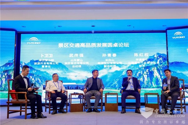 为了进一步挖掘旅游市场需求,精准做好服务,提升景区品牌影响力和吸引力,神农架山和旅游开发有限公司董事长卜卫卫、山东蒙山旅游集团有限公司总经理武传强、长白山旅游股份有限公司副总经理孙青春及宇通客车股份有限公司公路产品管理部部长陈红权围绕“景区高品质发展”进行专题讨论,为景区可持续发展贡献了智慧力量。