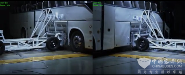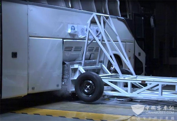 该车型装配了2组共8个福田欧辉70兆帕储氢瓶,氢瓶组安装在车辆下部行李舱位置。碰撞试验采用重达1.4吨的移动壁障以53公里/时的速度撞击福田欧辉70兆帕氢燃料客车最薄弱的氢瓶舱侧面氢系统加注侧舱门。该试验标准已经高于国家标准中检验锂离子动力电池客车碰撞安全的要求。