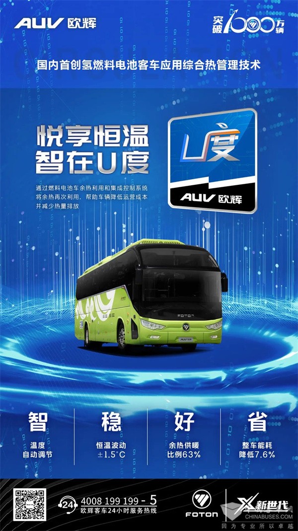 此外,为解决冬奥会期间时常面临低温环境的严峻考验与技术局限,此款车型还搭载福田欧辉国内首创的氢燃料客车应用综合热管理技术“U度”。可实现采暖制冷功能一键启动、车内采暖恒温控制、驾驶区和乘客区独立采暖等强大功能,最大程度为运动健儿和服务保障人员带来舒适乘坐体验。