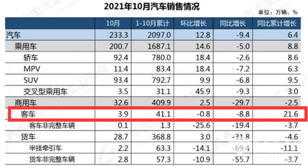 根据中汽协数据,2021年10月大中轻客车销量、同比: