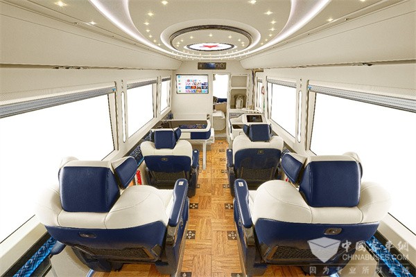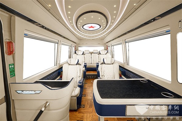 整车以胸怀大志、包容一切的胸襟创势而行,内外兼修,让质感随处尽显。贴心设计全隔断前后舱,营造舒雅空间,在泰然自若中书写人生壮志;一体式风道,集成音响、出风口、阅读灯等多种功能,简约大气。对坐洽谈桌+秘书桌,精心考究细节,方便调研办公;搭配50L大容量冰箱及定制雨伞架,目之所及,皆是匠心与精致。