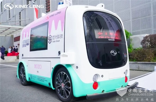 金龙MOSO自动驾驶售卖车,车辆能自动行驶、转弯、临停或绕行障碍物,可实现定点停车、固定路线巡航、预约停车等;可适应晴天、阴天、轻度雾霾、小雨等多种气候条件,为人们提供无接触的饮料、零食、便民物品的售卖服务。