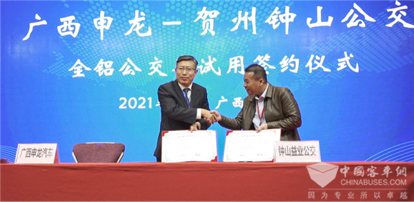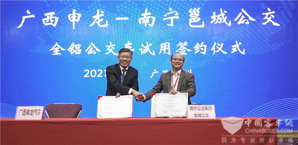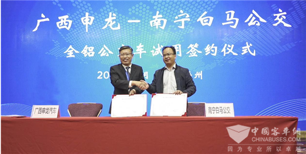 发布会同期,广西申龙分别与南宁公共交通集团有限公司、南宁白马公共交通有限公司以及钟山县益业公共汽车有限公司签订了全铝微循环城市客车试用协议,充分体现了广西申龙客车助力加快推进低碳交通运输体系建设的决心。