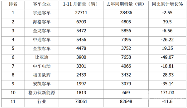 ●1-11月主流大中型客车累计销量:“两通三龙”领跑,格力钛新能源抢眼, Top10累计同比3增7减