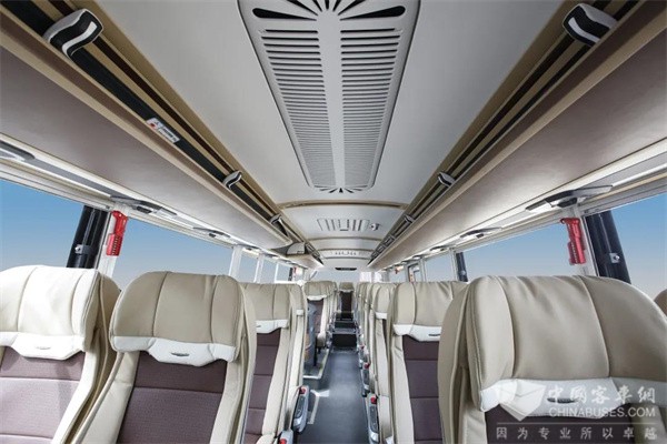 除提升座椅体验外,乘坐视觉享受也是重中之重。为营造温馨、豪华的车内氛围,BJ6122整车内饰采用暖色调,以棕色为主色,辅以米黄及黑白灰,整体配色为乘客带来温馨、高级的视觉感受。除此之外,车内还采用LED氛围灯组布置的航空式穹顶,只要通过驾驶区触控,即可实现整车同步、呼吸、渐进等七色变光效果。夜幕降临,按下灯光控制器,风道行李架、仪表盘等处多彩氛围灯齐开,“沉浸式”氛围瞬间到位,为疲劳旅途增添一丝愉悦与放松。