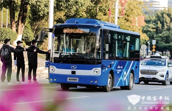 2018年,金龙客车与百度共同研发的中国首款L4级量产自动驾驶巴士正式投入商业化运营,开启自动驾驶服务大众出行的新时代;2020年,金龙客车助力构建了“1+N”的自动驾驶产品战略,针对零售、物流、安防及环卫等领域研发推出多款自动驾驶产品,让智慧出行进入更多领域。2021年4月,金龙客车助力全国首台L4级自动驾驶公交车在重庆市永川区投入商业化运营,系全国首创,实现了从封闭园区到开放道路的新突破。