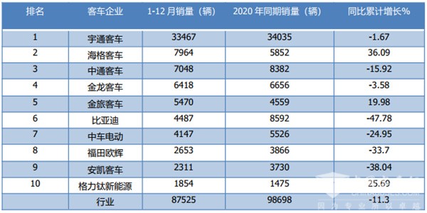 根据中国客车统计信息网数据,2021年1-12月TOP10大中型客车累计销量及同比: