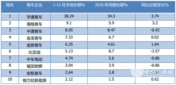 上表可见,在2021年1-12月7米以上客车累计销量中,Top10客车企业呈现以下特点: