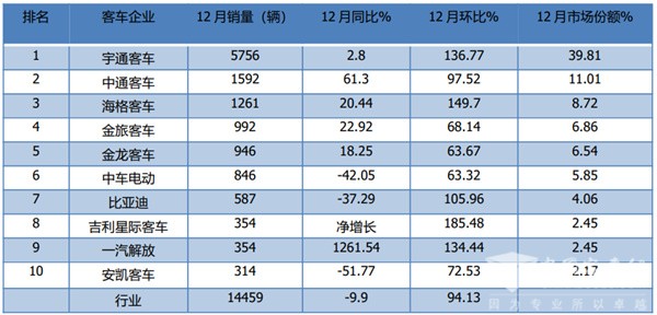 ●1-12月大中型客车企业销量:“两通三龙”位居前五,Top10累计同比3增7将,海格大涨36.09%