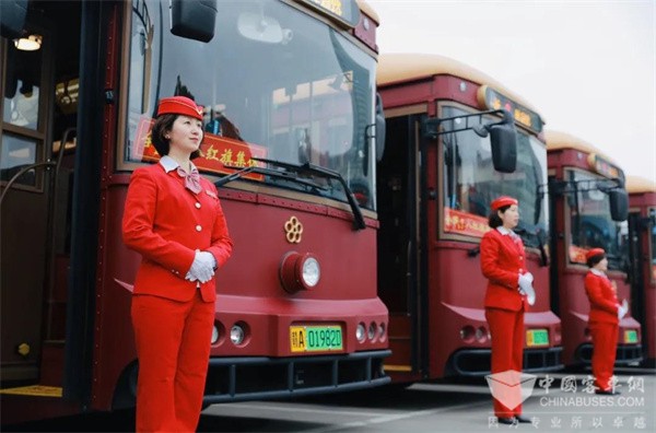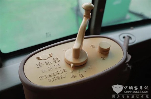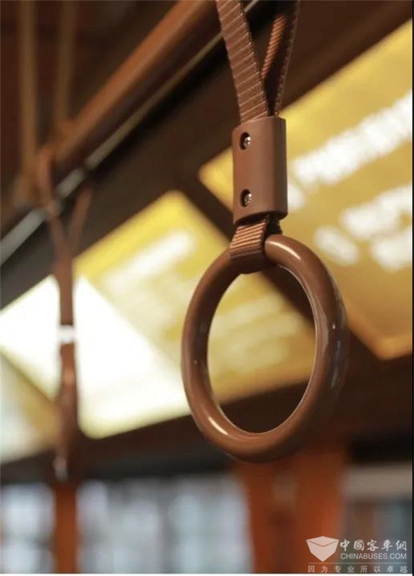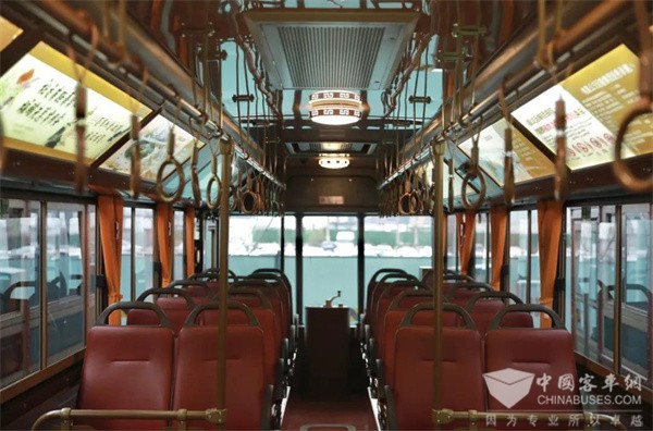 尽管造型复古,但车辆配置却颇为“现代”。10.5米车身,采用超大的空间设计,整车装配空气悬挂,减震效果极佳,应对减速带、颠簸路段效果尤为明显;结合疫情防控要求,每台车上还装有电子测温仪,让乘客乘车更放心。