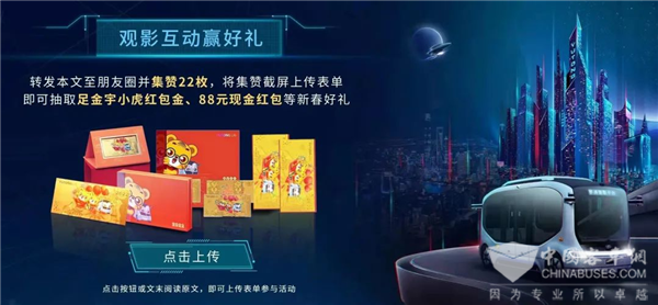 在预热活动引发全网讨论时,宇通客车抓住时机,联动站内官方平台陆续发布科幻微电影,更有观影互动集赞赢好礼活动。与此同时,微信平台发放主题贺岁红包封面、抖音平台发起带话题拍摄团聚时刻挑战赛,承接预热活动流量,持续构建传播涟漪效应。