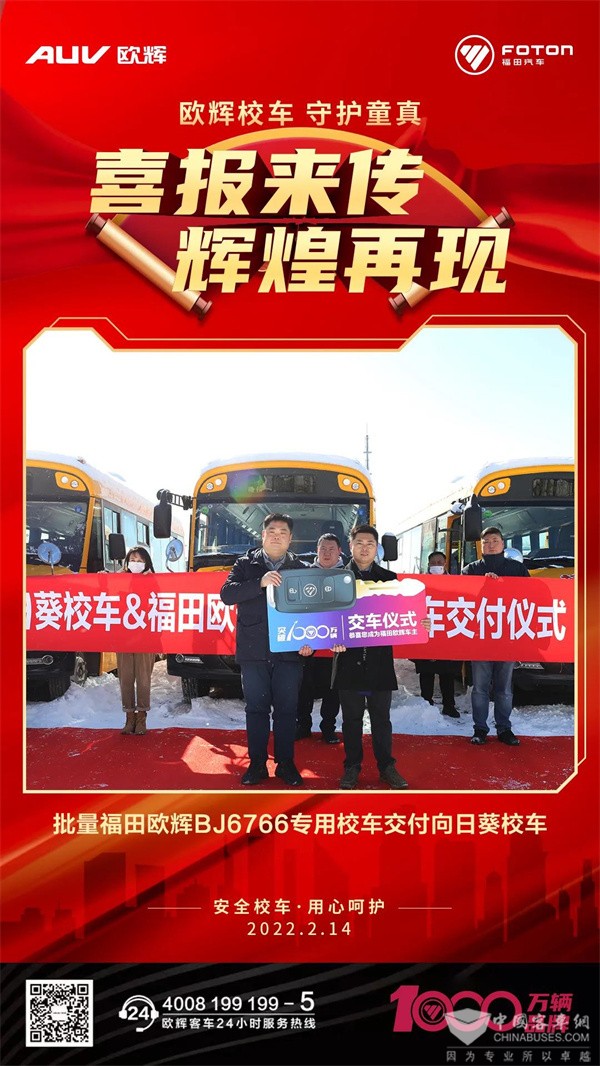 2022年2月14日,向日葵校车&福田欧辉战略合作暨批量专用校车交车仪式在北京成功举办。向日葵校车董事兼战略发展与行政管理委员会主任张晓东,欧辉营销副总裁王晓亮等领导出席交车仪式。此次交车是向日葵校车与福田欧辉的首次合作,欧辉专用校车的交付将助力向日葵校车市场进一步扩大发展,为更多孩童带来更安全、健康的出行体验。