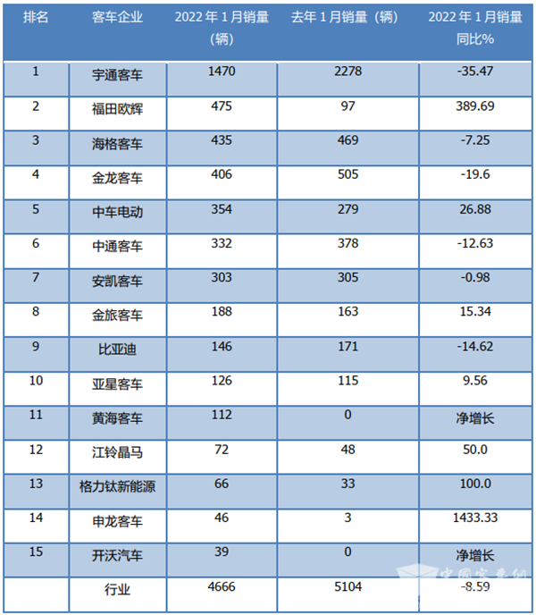 2022年1月大中型客车销量榜单及简析
