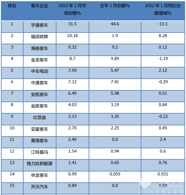 上表可见,在2022年1月7米以上客车销量占比中,TOP15客车企业呈现以下特点: