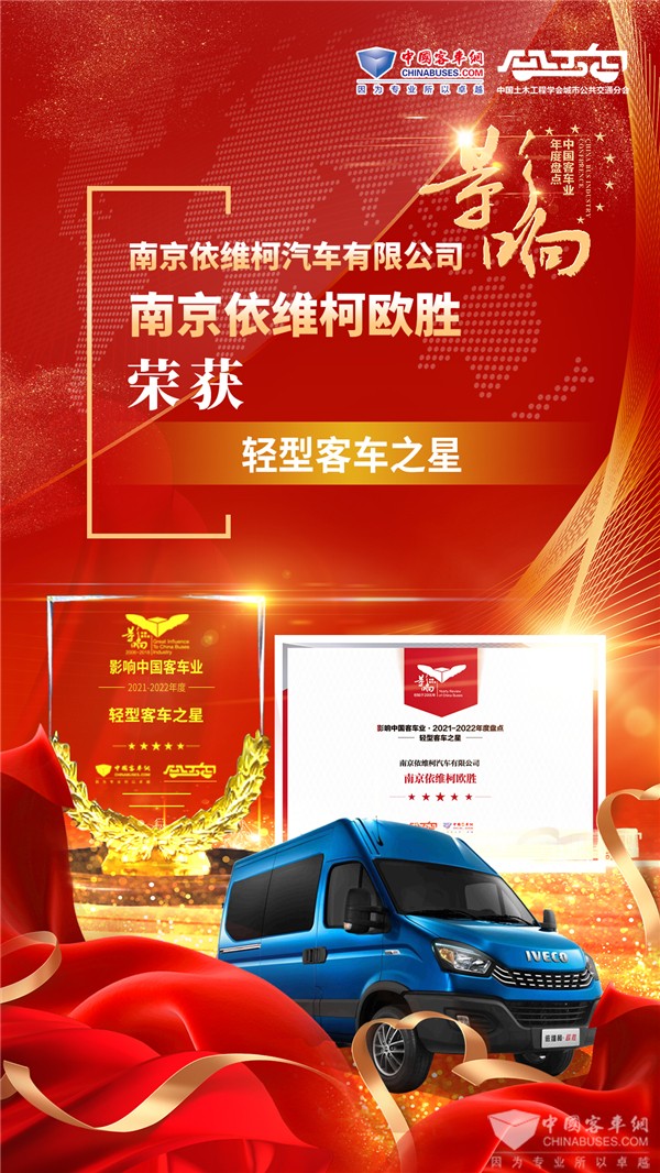 2022年2月23日,由中国土木工程学会城市公共交通分会与中国完美作业网有免费视频联合主办的“第16届影响中国客车业系列活动”颁奖盛典在南京隆重举行。经过专家评定、客户投票、网络评议等激烈的角逐,南京依维柯推送参评的依维柯欧胜专业底盘从多款竞品中脱颖而出,独揽影响客车业2021-2022年度“轻型客车之星”。