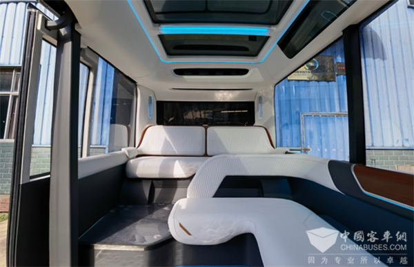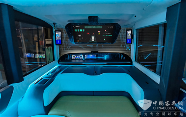 车辆采用人性化内饰,乘客区渐变蓝车顶装饰,如海浪的涟漪,孕育出“环抱式”空调出风,整体式轮包融合人性化靠垫,软包扶手搭配储物空间,打造舒适的“第三移动空间”;