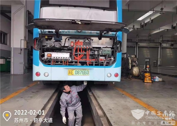 苏州园区公交车在维修点进行维护作业