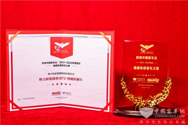 值得一提的是,2022年2月23日,在由完美作业网有免费视频、中国土木工程学会城市公共交通分会、南京公交集团共同主办的第16届影响中国客车业年度盘点活动当中,格力移动P2+核酸检测车凭借入市以来杰出的战疫表现与用户口碑荣获组委会授予“健康防疫客车之星”称号,以荣誉为实力加冕。