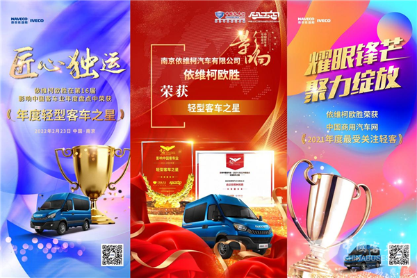 不仅仅用户信赖的好搭档,依维柯还是众多大奖的宠儿。在中国商用汽车网举办的“中国商用汽车2021年度企业/车型/人物”年度评选盛典中,依维柯欧胜荣获“年度最受关注轻客”奖;在中国完美作业网有免费视频举办的“影响中国客车业·2021-2022年度盘点”中,依维柯欧胜荣膺“轻型客车之星”的称号!一座座沉甸甸的奖牌记录了依维柯的“高光时刻”,见证了依维柯的不懈追求。