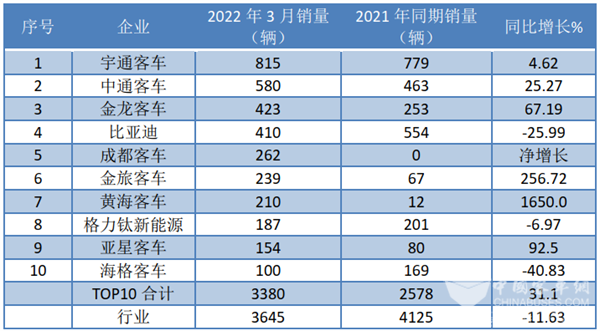 2022年3月新能源客车销量TOP10同比统计(数据来源:中国客车统计信息网):
