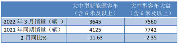上表显示,2022年3月大中型新能源客车同比增长-11.63%,跑输2022年3月大中型客车增幅(-2.35%)近9.28个百分点,导致2022年3月大中型客车整体市场继续下滑。