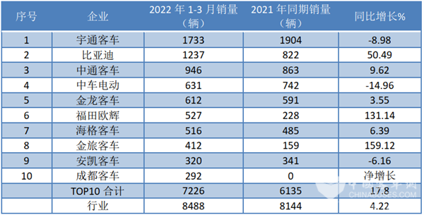 2022年1-3月新能源客车销量TOP10同比统计(数据来源:中国客车统计信息网):