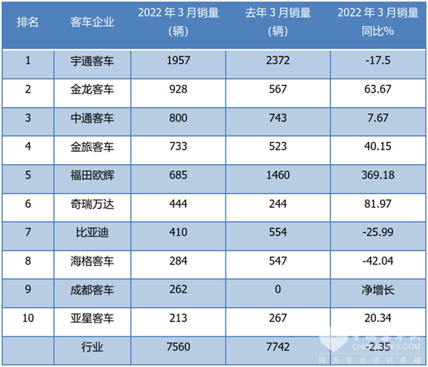 根据中国客车统计信息网数据,2022年3月6米以上客车Top10排行:
