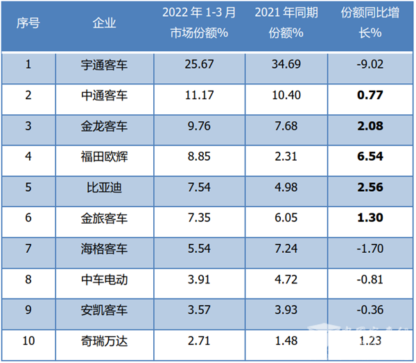 从上表看出,2022年1-3月新能源客车Top10中市场份额变化特征是:
