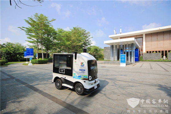自动驾驶小巴“小宇”,由宇通客车研发,采用太空舱造型、科技感满满,是世界首款获得德国红点奖的自动驾驶车型,也是行业首款支持无安全员运行的自动驾驶巴士。